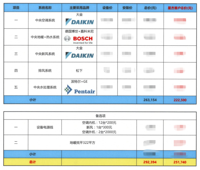 家居集成系統(tǒng):大金VRV-P中央空調(diào)系統(tǒng) 大金新風系統(tǒng) 松下排風扇 博世歐洲之星鍋爐 嘉科米尼地暖管路系統(tǒng) 濱特爾中央水處理 威樂循環(huán)泵