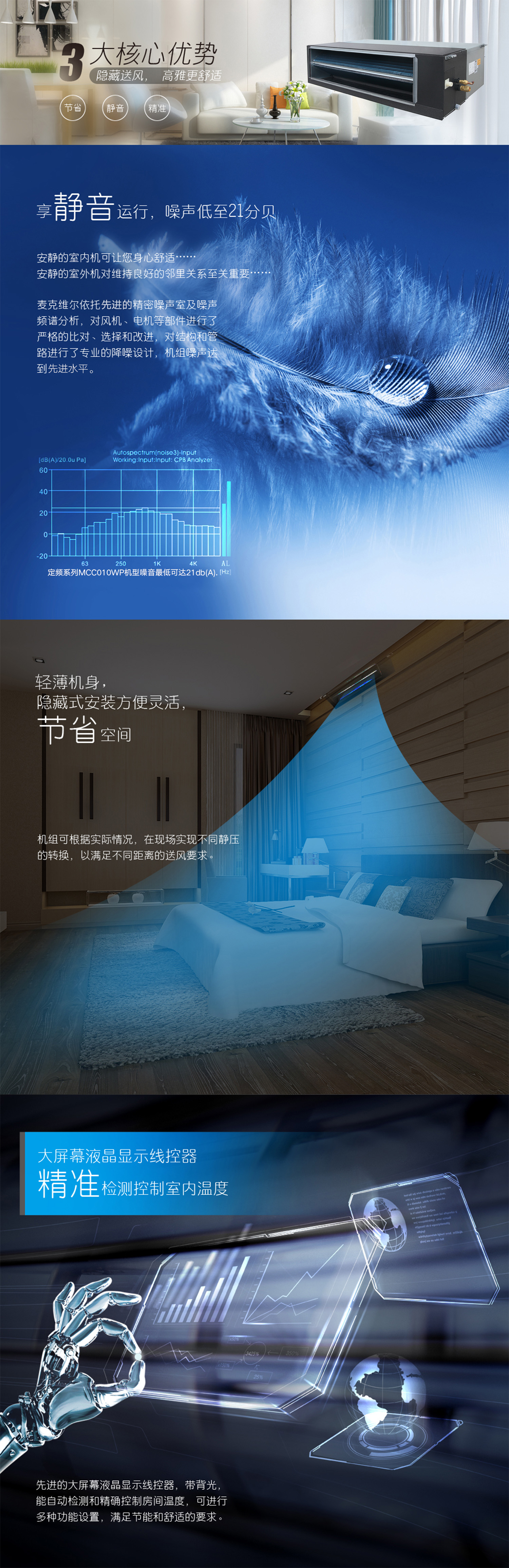 產(chǎn)品理念:采用變頻科技,讓機(jī)組時(shí)刻處于高效的工作狀態(tài)。應(yīng)用窄型結(jié)構(gòu)設(shè)計(jì),大幅度節(jié)約安裝所用空間,可與各類裝修風(fēng)格融合。依托于精密噪音實(shí)驗(yàn)室和先進(jìn)的多通道噪聲分析模擬軟件,通過結(jié)構(gòu)和控制邏輯的優(yōu)化創(chuàng)新,針對(duì)性的對(duì)室內(nèi)機(jī)噪聲源進(jìn)行遏制和隔斷,打造安靜的室內(nèi)空間。