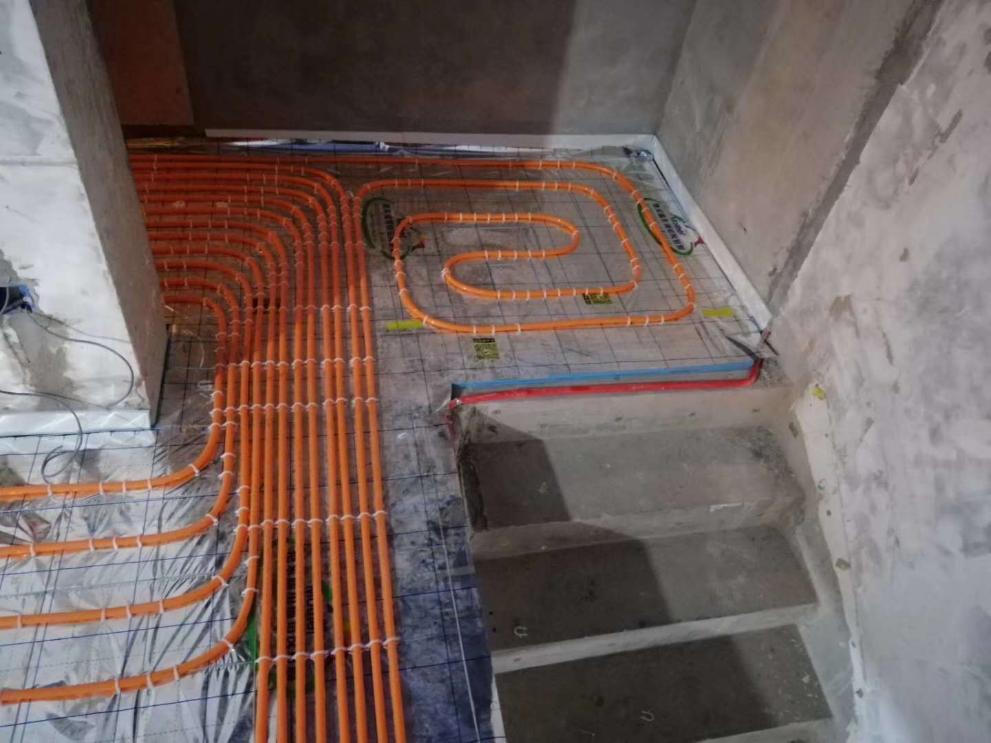 第一步是鋪設(shè)保溫板和反射膜。在我們把地面清理干凈以后,首先在原有地面上鋪我們選擇的擠塑板,擠塑板一定要鋪得平整嚴(yán)密,然后用膠帶進(jìn)行固定。在擠塑板的上面開始鋪反射膜,反射膜要鋪嚴(yán),反正膜交接的地方同樣也要使用膠帶進(jìn)行固定。第二步是鋪底層鋼筋網(wǎng)片。鋼筋網(wǎng)片的規(guī)格一般是10mm×10mm,鋼筋網(wǎng)片所使用鋼筋的直徑一般是3mm。鋪設(shè)鋼筋網(wǎng)片的目的也就是為了固定我們的地盤管,防止位移以及澆筑混凝土?xí)r出現(xiàn)的管道的上浮等情況。第三步是鋪地采暖的地盤管道。地采暖的地盤管道就是地采暖的地盤管的安裝,具體安裝的時(shí)候是從分集水器開始,按照我們的設(shè)計(jì)要求鋪設(shè)每個(gè)房間的地采暖管道。這里要求的是管道之間的間距要符合要求,另外每個(gè)回路的長(zhǎng)度要大概一致。此外單個(gè)的長(zhǎng)度盡量要控制在100米以內(nèi)。最后使用扎帶把地才能管道與鋼筋網(wǎng)片進(jìn)行固定。第四步是鋪設(shè)上層鋼筋網(wǎng)片。在地采暖管道鋪設(shè)完成以后,我們需要在地采暖管道的上層再鋪設(shè)一層鋼筋網(wǎng)片。鋪設(shè)這層鋼筋網(wǎng)片的作用是防止我們的后澆層出現(xiàn)開裂。在鋪設(shè)完上層鋼筋網(wǎng)片以后,一定要把上下層鋼筋片使用扎帶進(jìn)行固定牢固。第五步是澆筑回填層的混凝土。回填撐死凝土的厚度一般來說都是60mm左右,混凝土的強(qiáng)度一般都是C20的豆石混凝土。在澆筑的時(shí)候一定要注意防止地采暖管道出現(xiàn)位移和上浮的情況。澆筑完成以后要及時(shí)養(yǎng)護(hù),以防止造成地面的開裂。