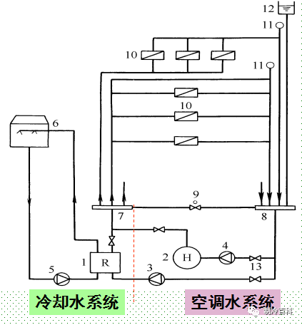 1-水冷冷水機(jī)組 ;2-鍋爐 ;3-冷凍水泵 ;4-熱水泵 ;5-冷卻水泵 ;6-冷卻塔 ;7-分水器;8-集水器 ;9-壓差控制閥 ;10-空調(diào)設(shè)備 ;11-自動(dòng)排氣閥 ;12-膨脹水箱 ;13-閥門