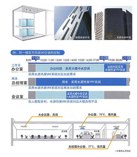 與傳統(tǒng)水系統(tǒng)中央空調(diào)配合,辦公時段采用大樓中央空調(diào),加班時段則可靈活采用水源熱泵VRV系統(tǒng)對應(yīng)空調(diào)需求。根據(jù)實(shí)際需 要,追加水源熱泵VRV系統(tǒng)。