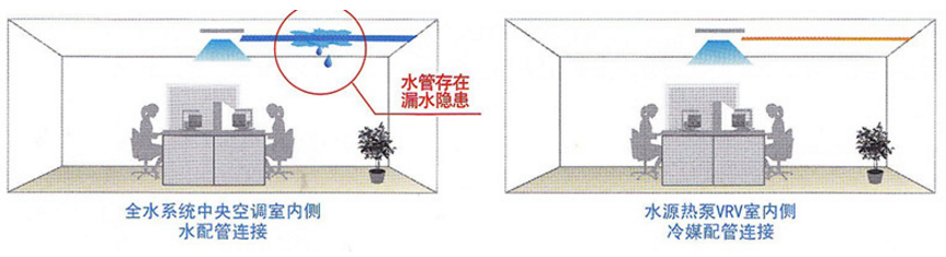 大金水源熱泵VRV主機(jī)與室內(nèi)機(jī)之間通過冷媒配管連接,水管集中布置于主機(jī)機(jī)房及管井內(nèi),大大降低了系統(tǒng)漏水對于室內(nèi)重 要設(shè)備破壞的隱患。