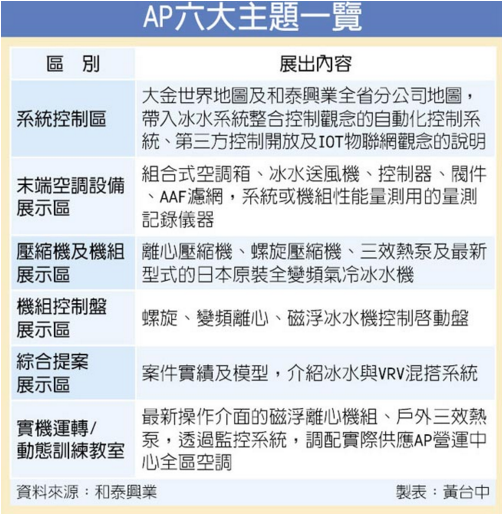 走入AP營運中心,開闊的迎賓時光廊區(qū)頓時吸引參訪者的目光,高達(dá)3層總數(shù)超過100只貨柜,建構(gòu)成強烈的工業(yè)風(fēng)格鋼鐵城堡。右側(cè)展示VRV及家用系統(tǒng),中央主展廳則為AP系列產(chǎn)品的展示,展廳內(nèi)分為六大主題(見右表),大金全系列商品一覽無遺。