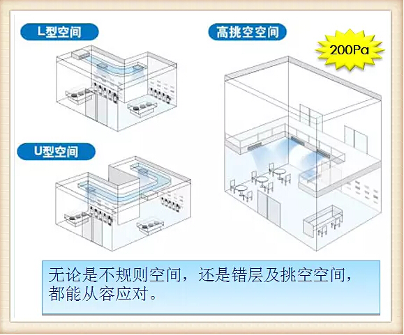 從機型來看,天花板嵌入式(環(huán)繞氣流)室內(nèi)機,對應大開間和方形空間,氣流均勻,造型更美觀。溫度分布情況大為改善;天花板嵌入導管內(nèi)藏式室內(nèi)機,對應狹長型、U型和L型等不規(guī)則空間,有多種送回風形式,輕松實現(xiàn)與內(nèi)裝的融合;自由靜壓風管室內(nèi)機,對應不規(guī)則空間和挑高空空間,即使內(nèi)裝格局經(jīng)常改變,也能輕松對應。