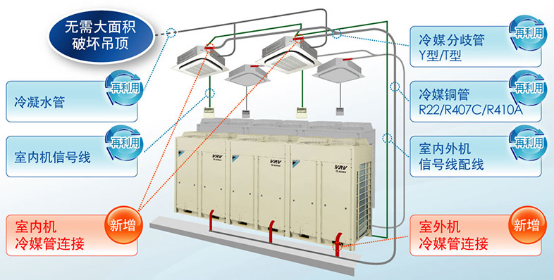 大金針對空調(diào)改造難題,憑借強大的研發(fā)能力,針對空調(diào)改造市場首推大金VRV更新用Q系列,讓大面積拆除吊頂與冷媒配管不再成為空調(diào)改造的必備流程,只需更換老舊空調(diào)系統(tǒng)的室內(nèi)機和室外機,即可輕松快速實現(xiàn)空調(diào)系統(tǒng)的改造。